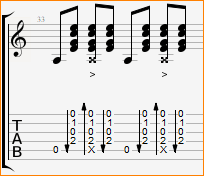 В припеве же все попроще — я начинаю играть гитарным боем, причем идет отстукивание ритма по басовым струнам на каждую слабую долю.
